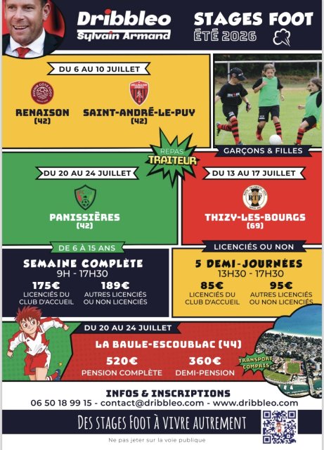 Veuillez trouver ci-joint un flyer présentant le stage organisé par DRIBBLEO, en partenariat avec notre club, qui se déroulera sur nos installations du 13 au 17 juillet 2025.